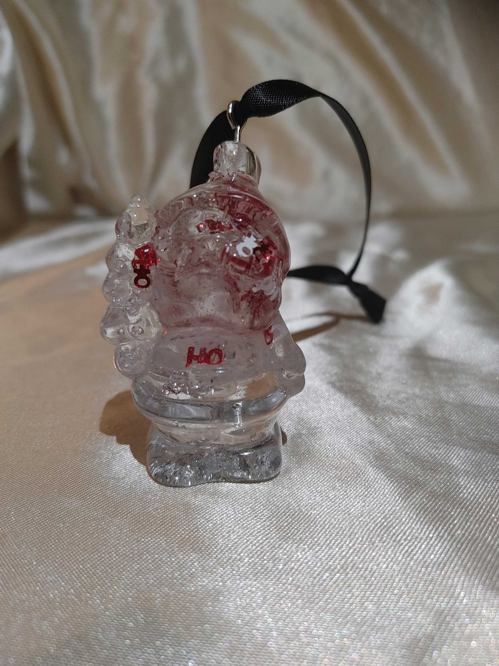 Molded clear resin Santa ornament with embedded Ho Ho glitter and silver flakes is a perfect addition to your tree or other Christmas decor! Attached black ribbon for hanging.
