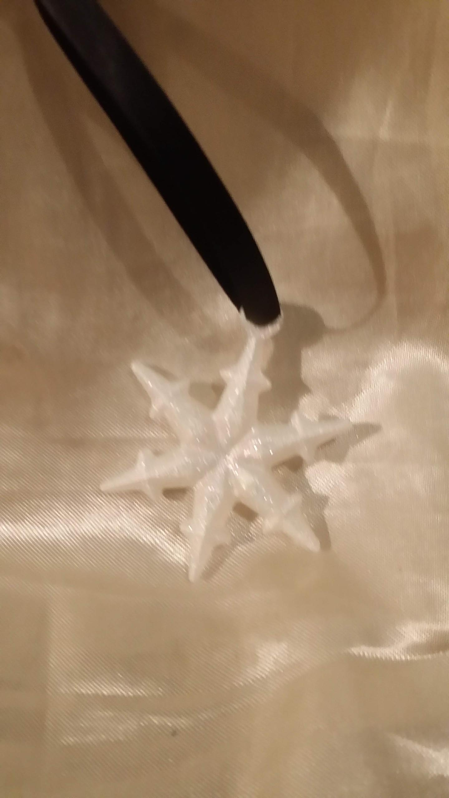 Molded resin snowflake ornament with embedded white glitter is treated with white mica powder for iridescent sheen. Attached black ribbon for hanging.