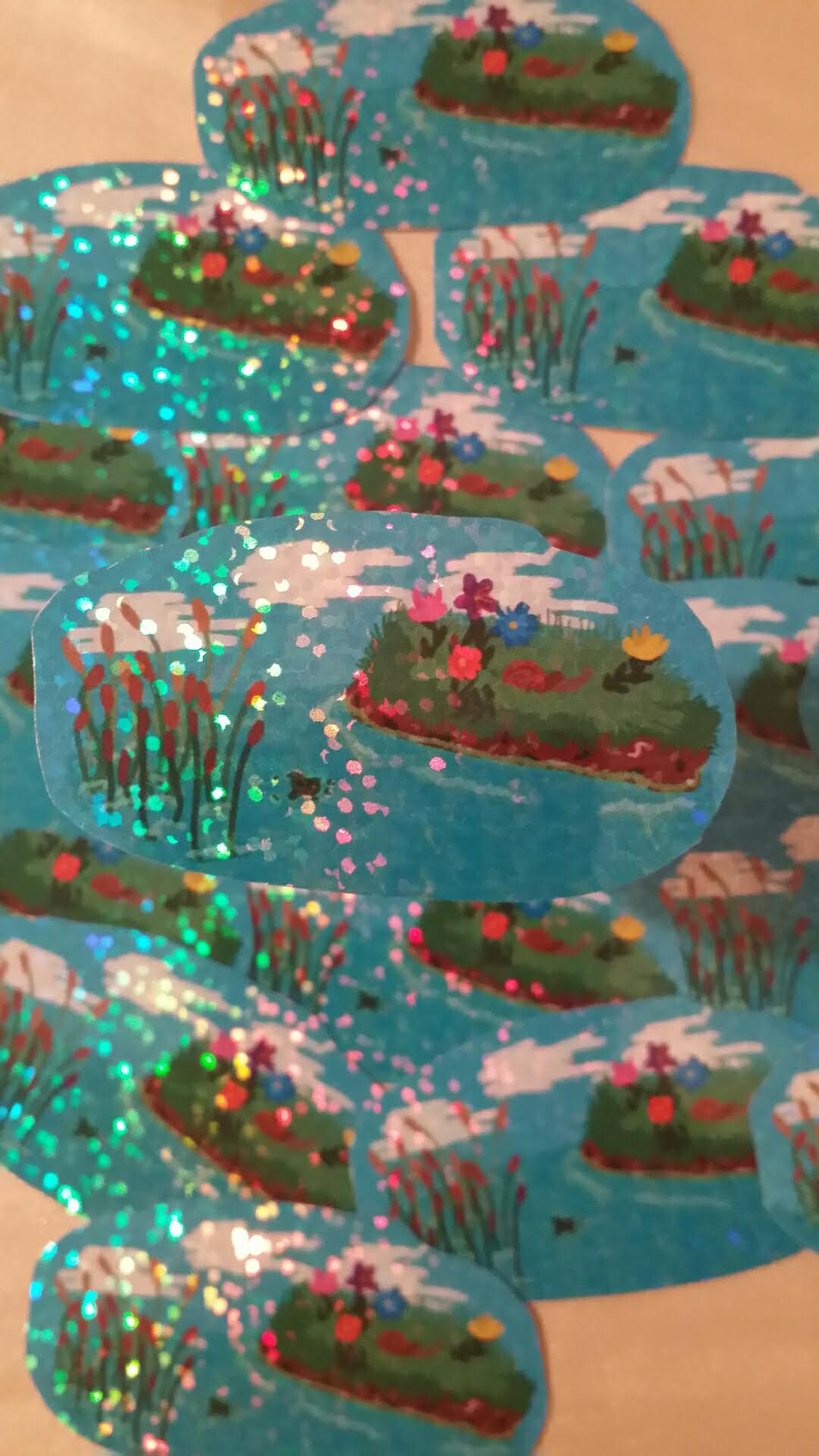 Original artwork printed on vinyl sparkle glitter holographic sticker paper.